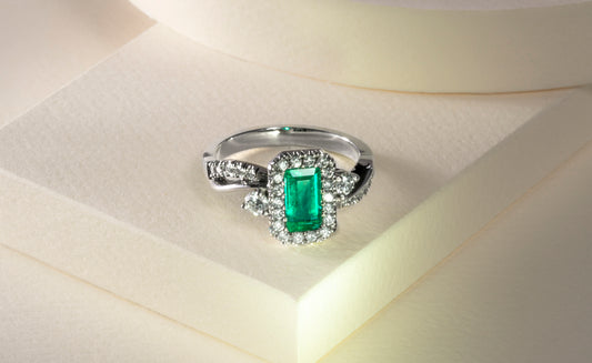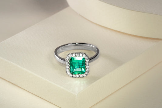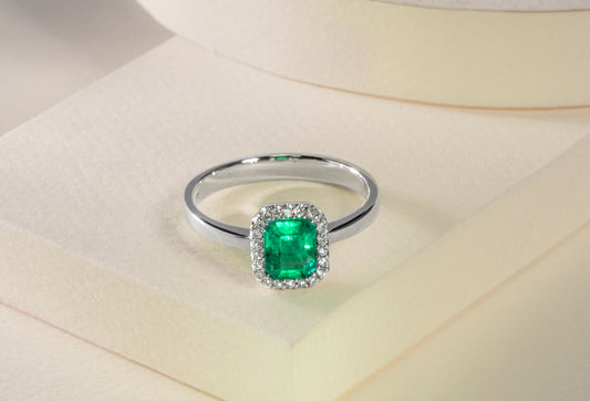 Anillo cluster oro blanco con esmeralda y diamantes naturales - ANB061