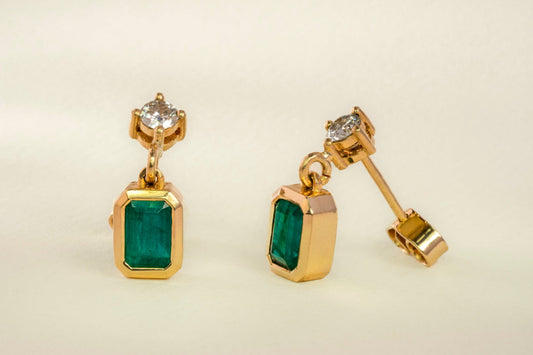 Aretes colgantes oro amarillo con esmeraldas y diamantes naturales - ARA063