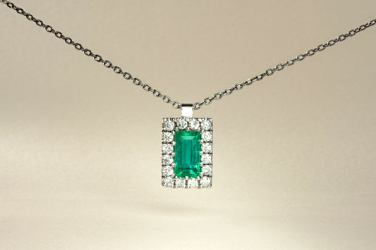Dije cluster con cadena oro blanco con esmeralda y diamante naturales - DOB008