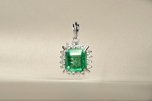 Dije cluster oro blanco con esmeralda y diamante naturales - DOB031