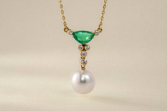 Dije con cadena oro amarillo con esmeralda, diamantes y perla natural - DOA070