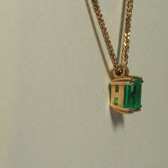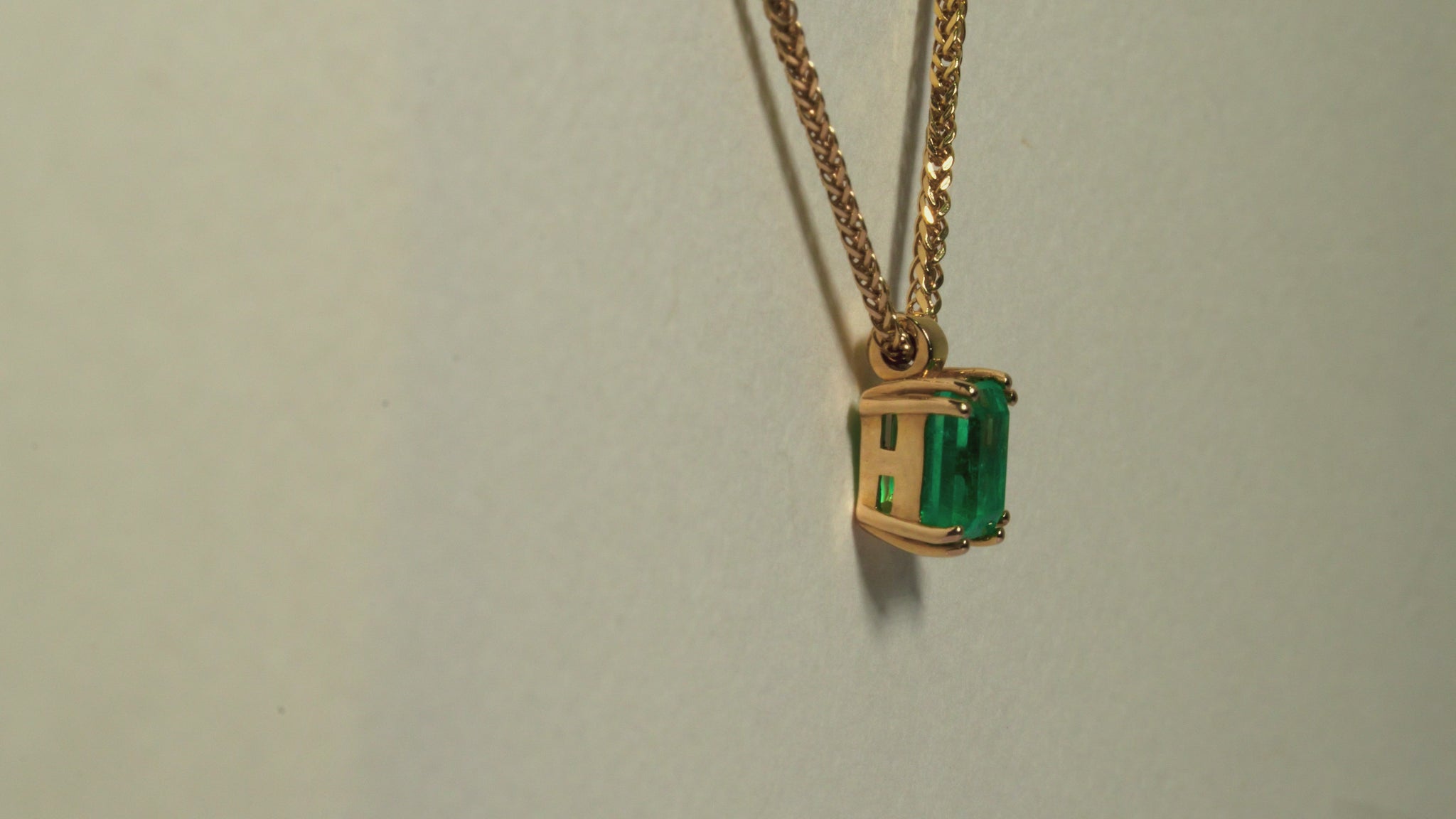 Dije con cadena elaborado en oro amarillo de 18k con una esmeralda talla esmeralda de 1.05ct engastada en uñas dobles y 2.22gr de peso total.